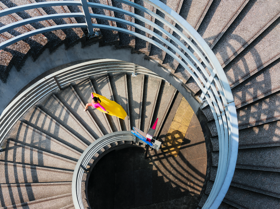 Gracefully running up the stairs before the clock strikes 12, a long fluorescent train trails behind her every step. A combination of natural shadows and light illuminate the pavement with unique patterns and prints!